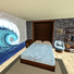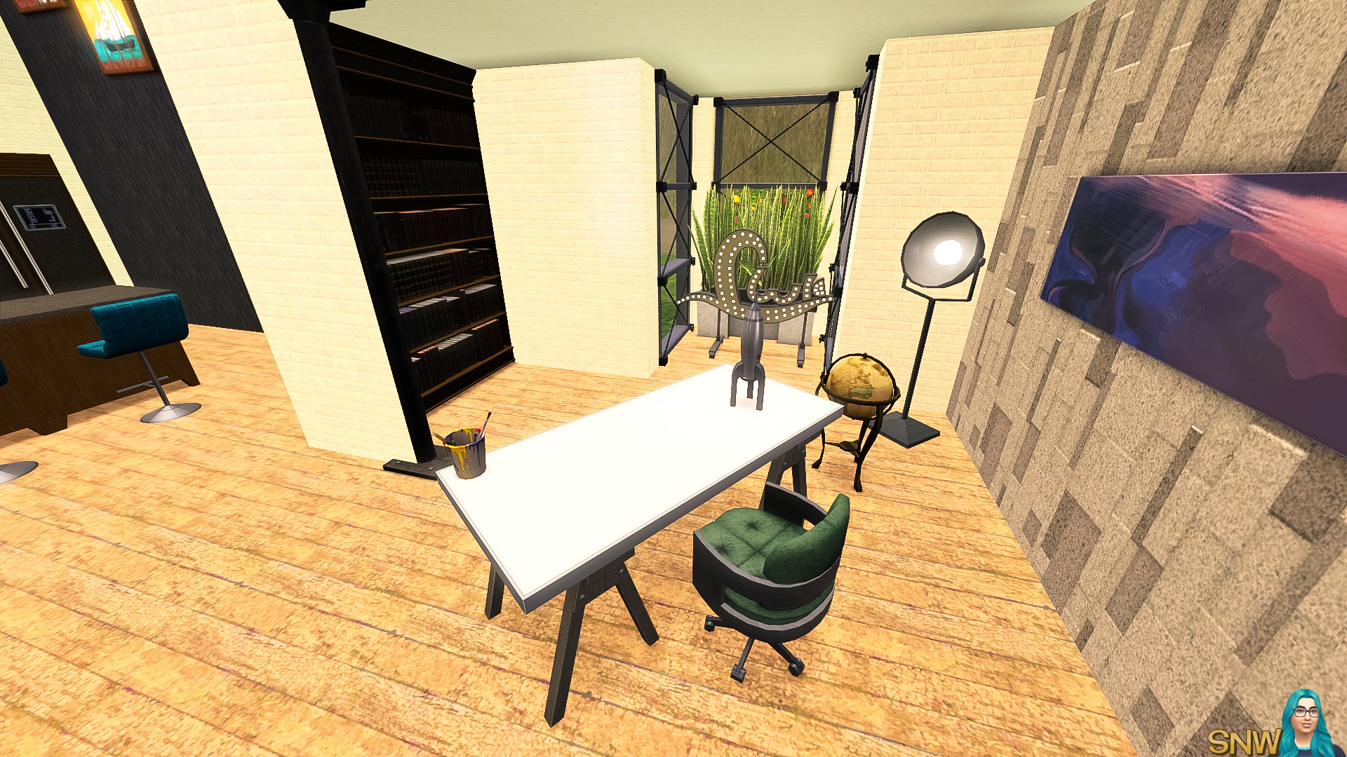 Dit loft heeft de meeste hipstermeubeltjes van allemaal. De trap brengt je naar de slaapkamer en aparte badkamer. Wederom zijn alle basics aanwezig. Er is nog een aparte kamer met een eenpersoonbed, een bureau en een kledingkast. In principe zou je hier met 3 Sims kunnen wonen, maar dat is waarschijnlijk veel te klein. Ik zou hier maximaal 2 Sims in laten wonen.