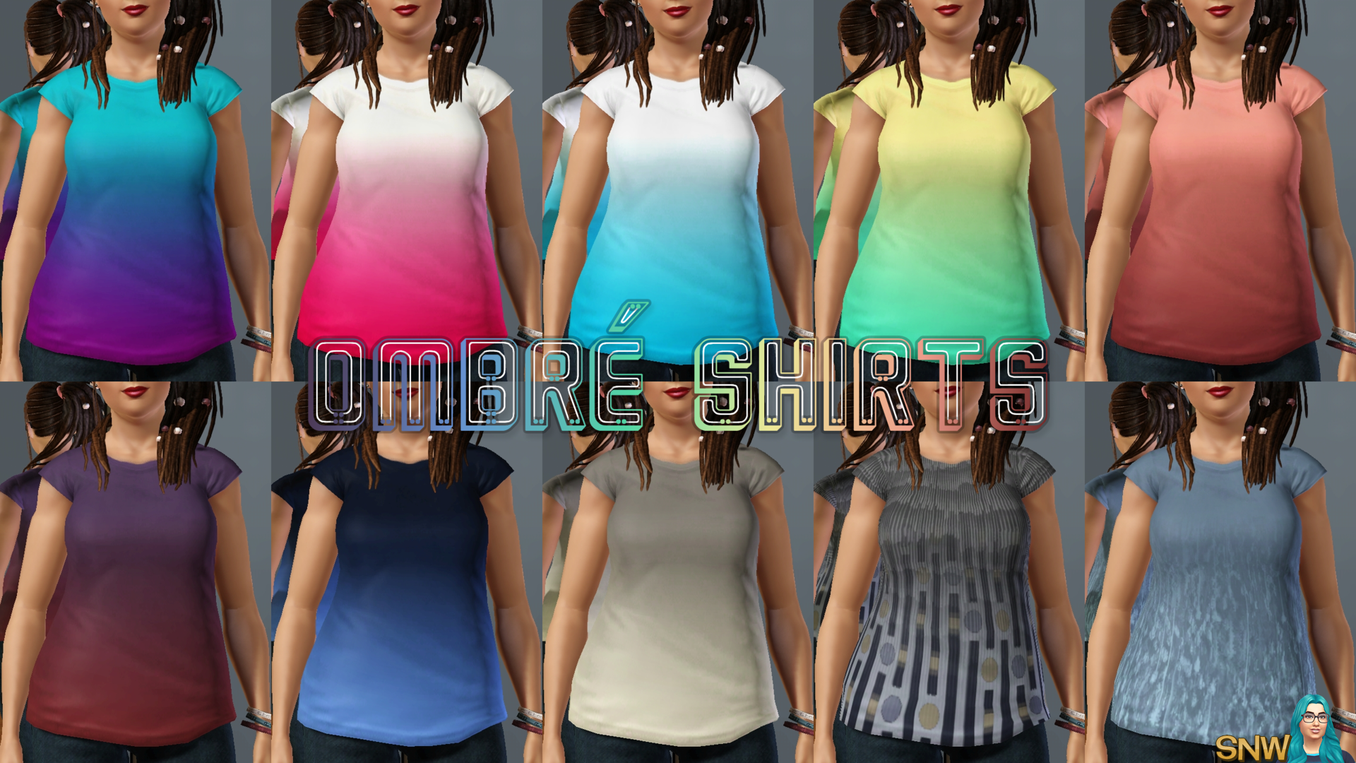 Ik ben pas geleden weer begonnen met het maken van custom content. Ik ben best tevreden met mijn spel, omdat ik alle uitbreidingen, accessoirespakketten, en zo'n beetje alle sets uit de store heb. Maar soms mis ik gewoon nog steeds bepaalde items. Vooral als ik kijk naar wat ik in het echte leven zou dragen en gebruiken. Daarom heb ik besloten om dit ombré stijl shirt te maken voor mijn vrouwelijke Simmetjes! Ik heb ook 10 presets gemaakt waar je uit kunt kiezen! Allemaal inbegrepen in hetzelfde bestand