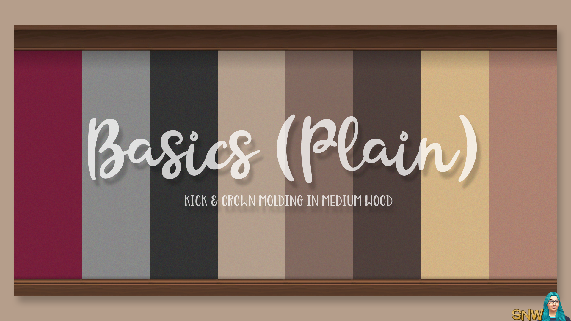Deze muur is onderdeel van de Basics Wallpapers set. Het is een effen muur (heeft dus geen patroon). De muren hebben medium houten plinten en kroonlijsten. Er zijn 32 kleuropties om uit te kiezen.