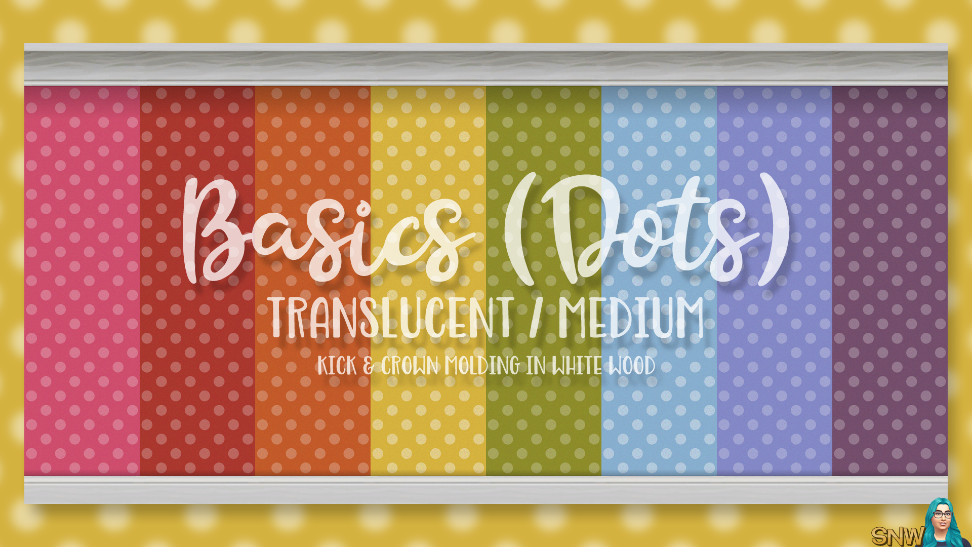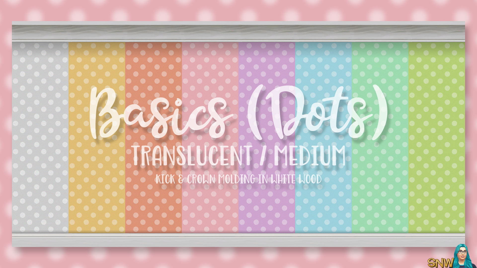 Deze muur is onderdeel van de Basics Wallpapers set. Het is een semi-transparante, medium stippen muur. De muren hebben witte houten plinten en kroonlijsten. Er zijn 32 kleuropties om uit te kiezen.