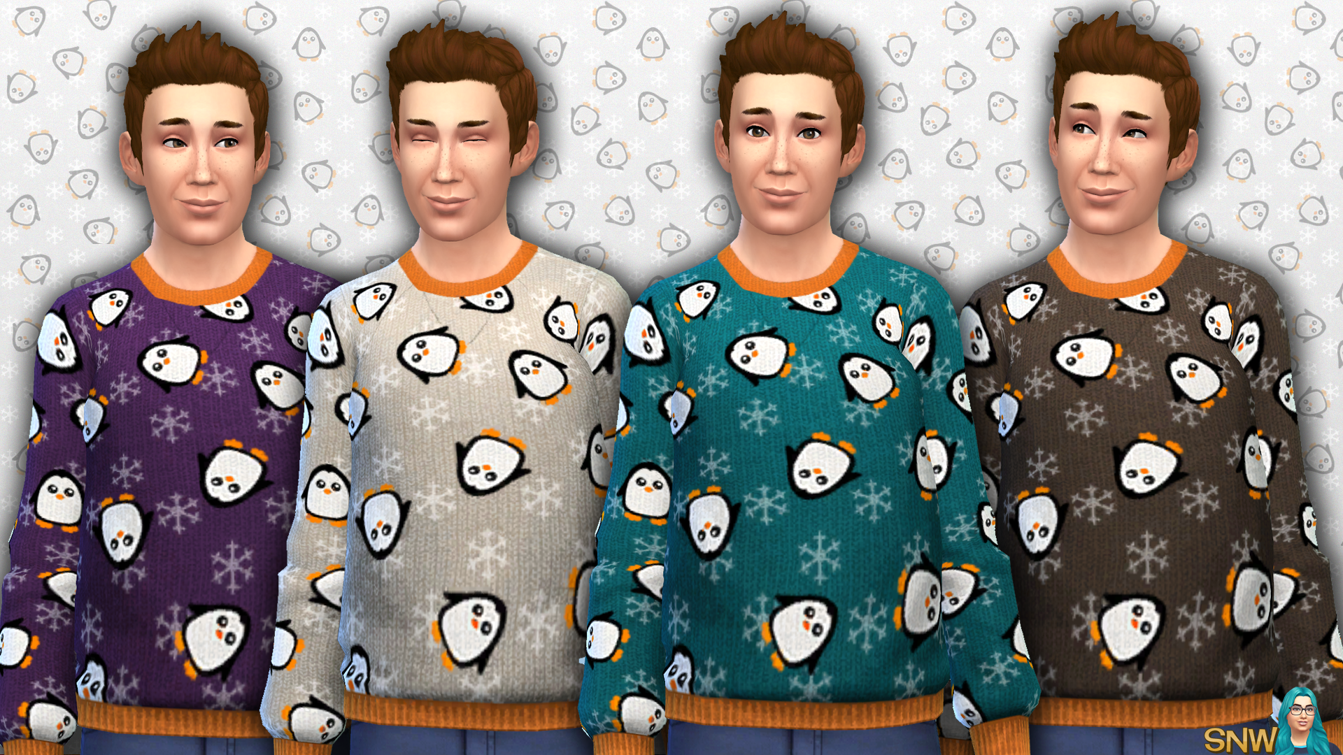 Ik heb een schattige pinguïnillustratie gemaakt voor Simsmas 2015, die ik gebruik om leuke wintertruien voor mijn Simmetjes te maken! Ik heb een aantal variaties gemaakt. Dit is de variant met een pinguïnpatroon over de hele trui. Er is ook een set truien met een pinguïnprint. En nog een set truien met pinguïns met kerstmutsen op!