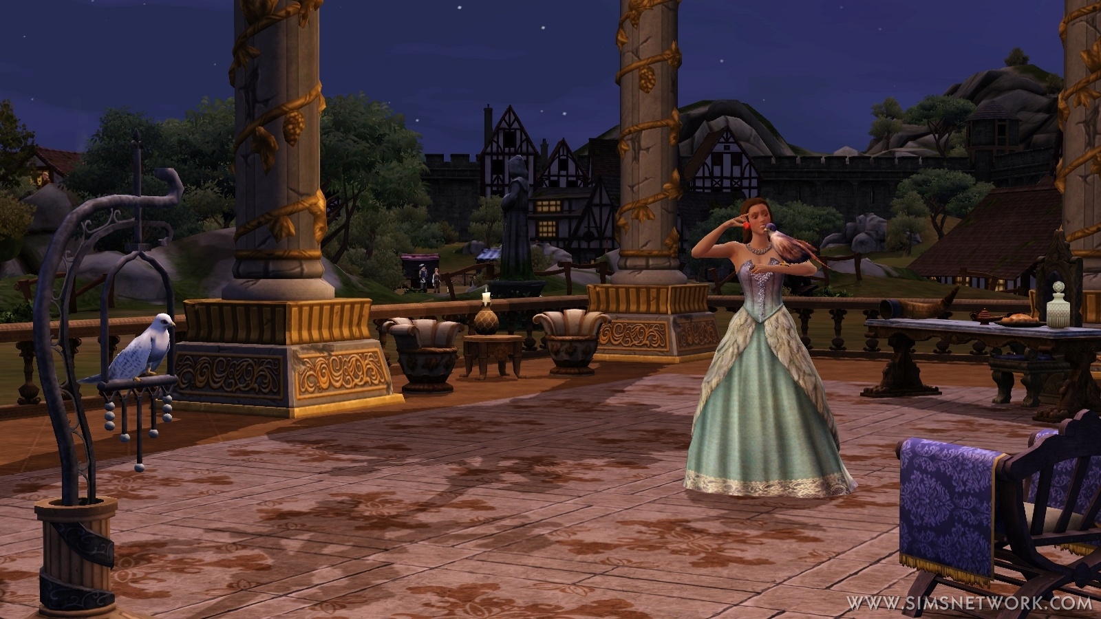 In De Sims Middeleeuwen: Piraten & Adel zijn er een heleboel nieuwe features. Een heel belangrijke nieuwe feature in het spel is het feit dat er dieren zijn! Papegaaien en valken. Ik vind het niet echt gepast om dit nou huisdieren te gaan noemen... Ze zijn meer een soort accessoire voor de Sims. Aaron liet ons zien hoe een piratenvrouw een papegaai wist op te trommelen, om vervolgens de opdracht te geven een andere Sim aan te vallen. Het was erg grappig, maar tegelijkertijd ook erg sneu voor die andere Sim! Nu kunnen we niet meer zeggen dat er geen Sims pijn hebben geleden tijdens deze demo! Andere interacties die je met de papegaaien kunt doen, en ik gok met de valken ook; Een Sim kan tegen de papegaai praten, je kunt de papegaai een naam geven, je kunt de papegaai trainen, ze op missies sturen en je kunt ze voederen. Er zijn waarschijnlijk meer interacties, maar ik zag het scherm niet heel goed.