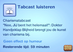 Een geweldige nieuwe feature is Naar Tabcast luisteren. Een Tabcast is een audiobestand waarmee je Sims hun vaardigheden kunnen verbeteren. Eigenlijk is het gewoon een podcast, maar dat mag ik denk ik niet zo noemen omdat podcasts gelinkt zijn aan Apple in de echte wereld.