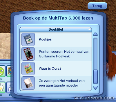 We gaan beginnen met Boek op de MultiTab 6.000 lezen. Deze optie stelt je Sims in staat om elk boek in hun huishouden te lezen. Hieronder vallen romans, vaardigheidsboeken en recepten.