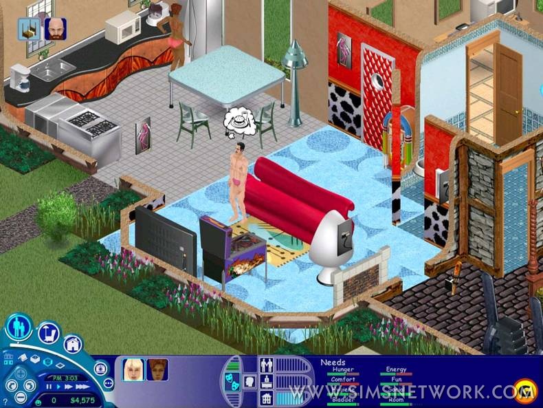 Our Livin' Large bachelor padWe've since been given a playable build of Livin' Large for preview purposes, and we've been busy introducing our Sims to the new objects and features of the add-on. Livin' Large boasts five new additions and enhancements to the original game: new characters, more than 120 new simulation items, three new decor and architecture styles, ten new careers for a total of 50 new jobs, and the ability to maintain ten neighborhoods - that's 50 Sim families - at once. Our build contained a little more than half of the themed items, yet there were more than enough to illustrate the sheer number of items the final product will contain. Interestingly enough, not all of these new items were created by Maxis - some user-created skins will be included in the retail version of Livin' Large. These skins were put together by fans of the game, uploaded to TheSims.com, and hand-selected by the designers at Maxis for inclusion in the game. This is part of Will Wright's goal to constantly empower users with the ability to change, customize, and mold Maxis games into their own product. Maxis PR manager Patrick Buechner had this to say about Wright's intention: "He was emphatic about getting the early tools out to users before the game was released. He had a sense that the fans would drive this if they were given the ability to customize [The Sims] and tell their stories via TheSims.com. He was also insistent about the need for interesting 'failure states,' like not making it to the toilet on time. For as many people that find it mundane to send their Sims to the toilet, there are many more who take joy in not sending them there." Such real-life catastrophes are plentiful in The Sims.