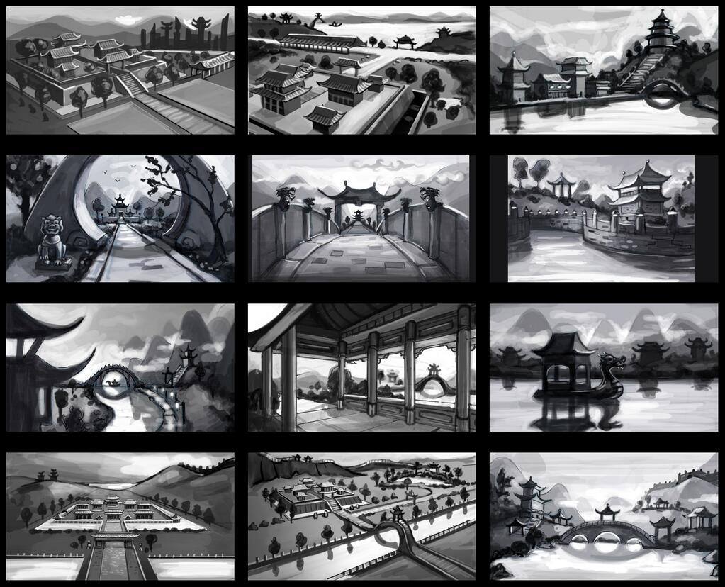 Some Sims 3 World Adventures concept art today! These are thumbnails from the early phases of brainstorming Shang Simla