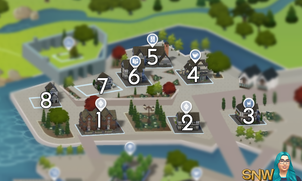Zoals je kunt zien heeft Windenburg 27 kavels. Dat is 6 meer dan de meeste andere werelden in De Sims 4. Hiervan zijn 3 kavels echter wel speciale locaties, waardoor je ze niet kunt veranderen in een ander kaveltype en je er ook niet kunt wonen. In theorie heb je dus 27 nieuwe kavels,m maar in de praktijk kun je er 24 volledig aanpassen en veranderen.
